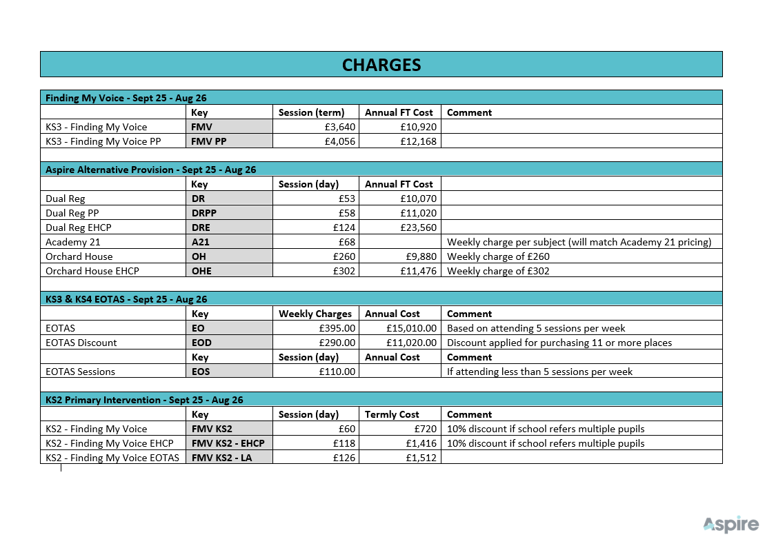 If your child is referred to Aspire and has an EHCP, this will be fully supported, however the cost to the mainstream school will be more. Parents and Schools should refer to our prospectus for more information.